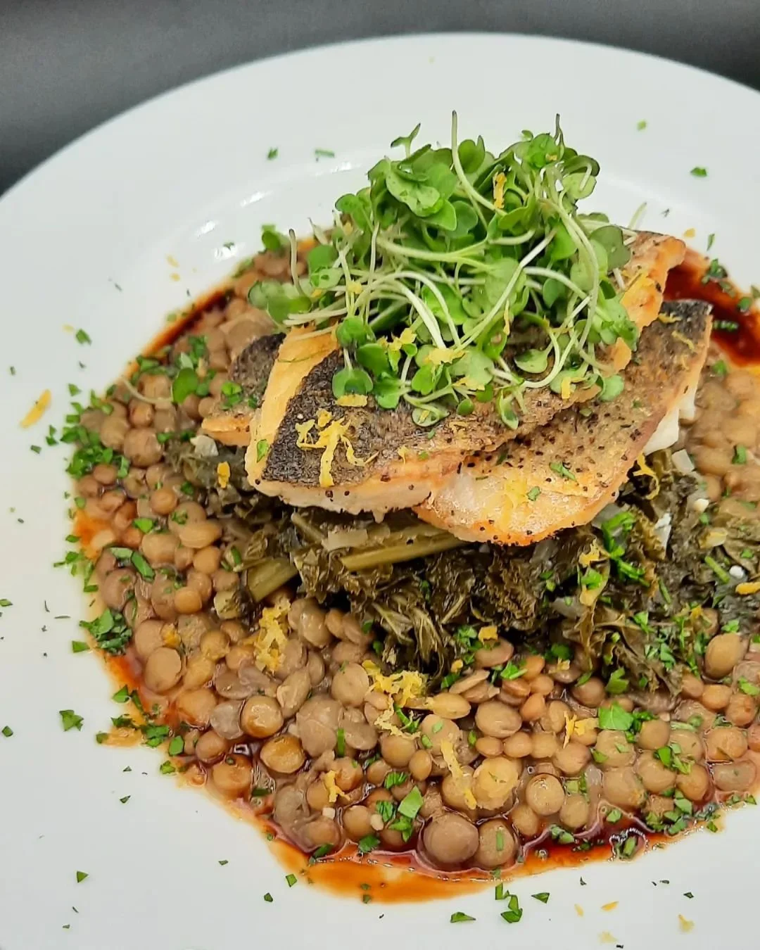 Stuffed Branzino, Mushroom & Spinach Filling, Miso Dashi, Microgreens