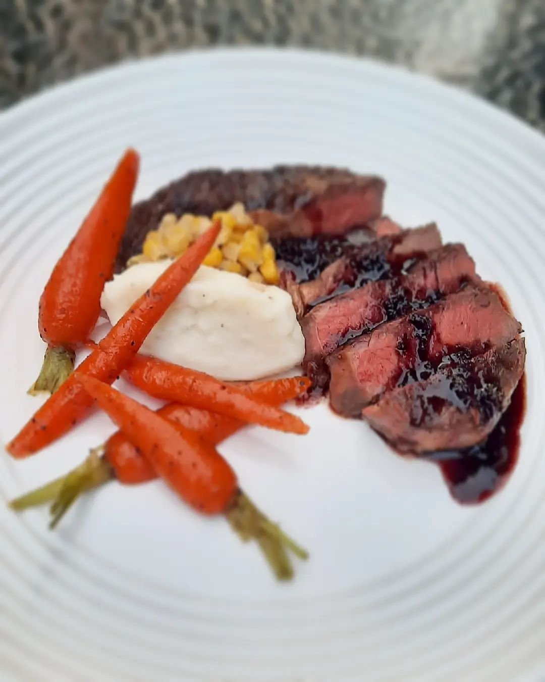 Seared Grass Fed Lamb Chops, Cauliflower Puree, Roasted Baby Carrots & Leeks, Garlic Herb Vinaigrette